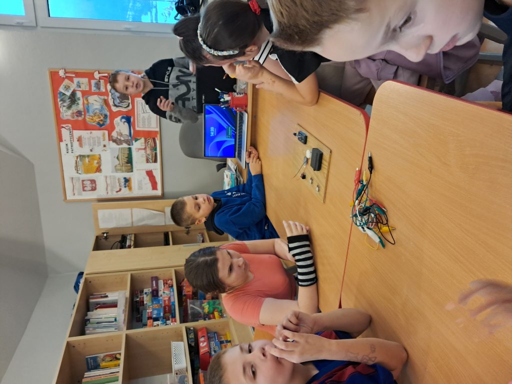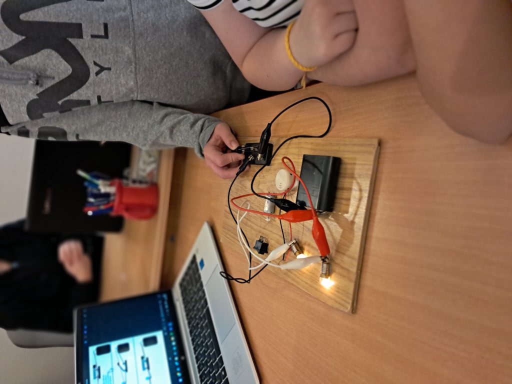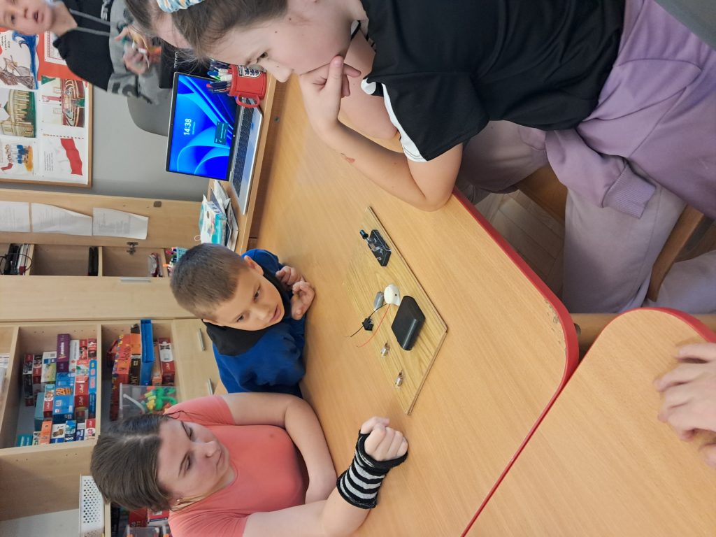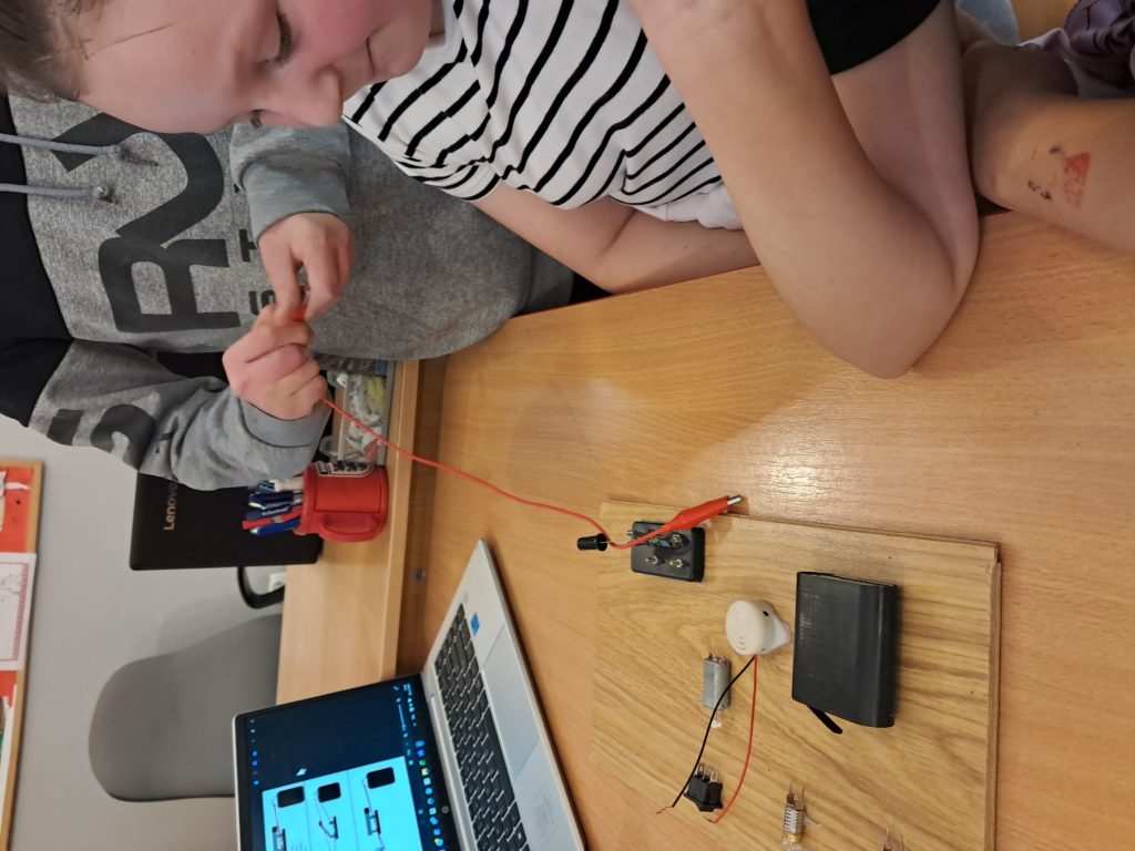 Mateusz rozpoczął zajęcia krótkim, prostym wyjaśnieniem, czym jest obwód elektryczny i dlaczego prąd musi mieć „drogę” do przepływu.