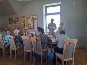 Uczestników serdecznie powitano przy aromatycznej kawie i herbacie oraz domowych wypiekach przygotowanych przez niezastąpione Koło Gospodyń Wiejskich w Wielkiej Wsi. W przyjaznej atmosferze odbyło się wzajemne zapoznanie i pierwsze zabawy integracyjne, które poprowadziła pani Maria Wantuch – doświadczona pedagog, wykładowczyni Akademii Tarnowskiej i aktywna członkini Uniwersytetu Trzeciego Wieku. Jej ciepło, zaangażowanie i umiejętność pracy z grupą stworzyły wyjątkową przestrzeń do wspólnej zabawy i współpracy.