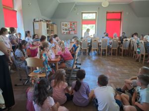 W dniu 2 lipca 2025 roku w Placówce Wsparcia Dziennego w Sukmaniu odbyło się pierwsze spotkanie w ramach projektu socjalnego „Kawa dla Babci i Dziadka”, którego celem jest budowanie więzi międzypokoleniowych pomiędzy seniorami a dziećmi z placówki. Spotkanie zorganizowane zostało przez pracowników socjalnych z Gminnego Ośrodka Pomocy Społecznej w Wojniczu – Katarzynę Krawczyk i Gabrielę Wantuch, autorki projektu, we współpracy z kierowniczką Placówki Wsparcia Dziennego w Sukmaniu Moniką Senderak i zespołem wychowawczyń, sołtysem Sukmania panem Markiem Kuboniem oraz sołtysem Olszyn panem Łukaszem Bielą.