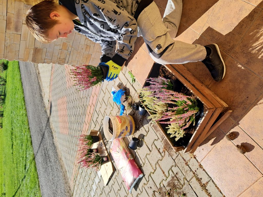 Zajęcia z sadzenia wrzosów były doskonałą okazją do poznawania przyrody i rozwijania umiejętności praktycznych. Dzieci samodzielnie sadziły wrzosy do doniczek, ucząc się, jak dbać o rośliny. Zajęcia rozwijały odpowiedzialność, cierpliwość oraz wrażliwość na otaczające środowisko. Praca z ziemią i roślinami sprawiła dzieciom wiele radości i była cennym doświadczeniem sensorycznym.